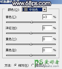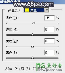19、创建可选颜色调整图层,对黄,中性色进行调整,参数及效果如下图。这一步微调暖色及中间调颜色。