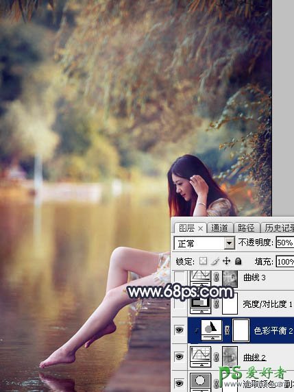 9、创建色彩平衡调整图层,对阴影、中间调、高光进行调整,参数设置如图27 - 29,确定后创建剪切蒙版,再把不透明度改为:50%,效果如图30。这一步同样给图片暗部增加蓝色。