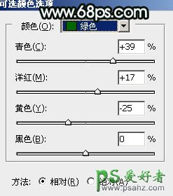 3、创建可选颜色调整图层,对黄、绿、黑进行调整,参数设置如图10 - 12,效果如图13。这一步主要给图片增加青绿色。
