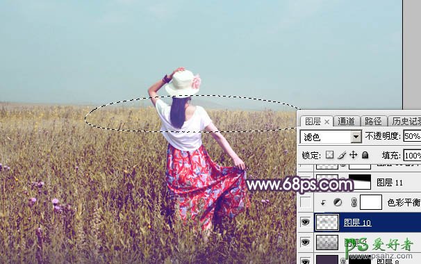 16、新建一个图层,按字母键“D”把前,背景颜色恢复到默认的黑白。然后选择菜单:滤镜 > 渲染 > 云彩,确定后把混合模式改为“滤色”,不透明度改为:50%。按住Alt键添加图层蒙版,用透明度较低白色画笔把下图选区部分擦出来。