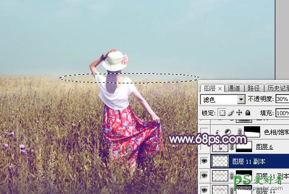 20、新建一个图层,用椭圆选框工具拉出下图所示的选区,羽化25个像素后填充同上的橙黄色,取消选区后把混合模式改为“滤色”,不透明度改为:30%。这几步给图片中间位置增加高光。