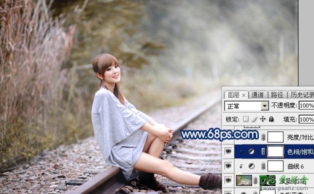PS美女后期调色教程:给铁路上的清纯女孩照片调出唯美的中性黄褐