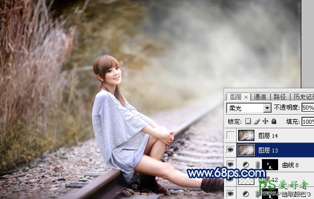 21、新建一个图层,盖印图层,选择菜单:滤镜 > 模糊 > 动感模糊,角度设置为45度,距离设置为100,确定后把混合模式改为“柔光”,不透明度改为:50%,效果如下图。这一步把图片柔化处理。