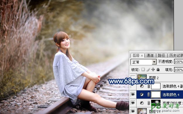 PS美女后期调色教程:给铁路上的清纯女孩照片调出唯美的中性黄褐