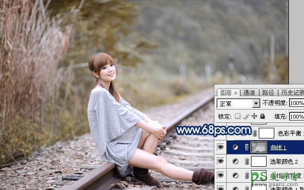 PS美女后期调色教程:给铁路上的清纯女孩照片调出唯美的中性黄褐