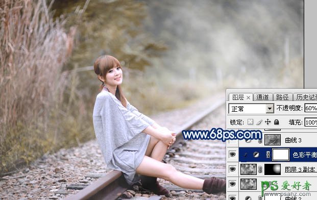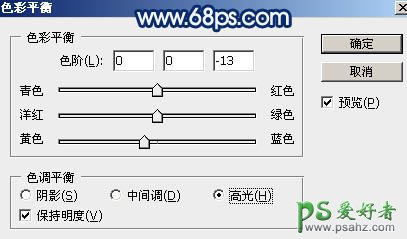 9、创建色彩平衡调整图层,对高光进行调整,参数设置如图19,确定后按Ctrl + Alt + G 创建剪切蒙版,再把不透明度改为:60%,效果如图20。
