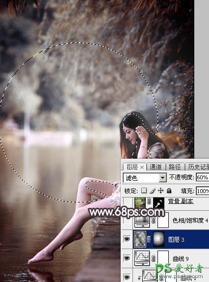 9、新建一个图层,按字母键“D”把前,背景颜色恢复到默认的黑白,然后选择菜单:滤镜 > 渲染 > 云彩,确定后把混合模式改为“滤色”,不透明度改为:60%。