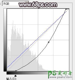 14、创建曲线调整图层,对RGB,蓝通道进行调整,参数设置如图32,确定后把蒙版填充黑色,然后用白色画笔把边角区域擦出来,效果如图33。这一步给图片增加暗角。