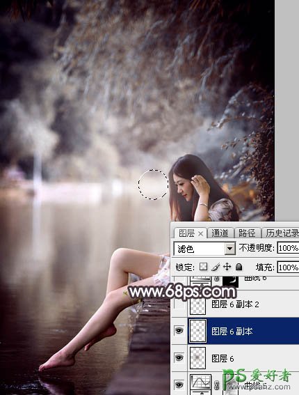 16、新建一个图层,用椭圆选框工具拉出下图所示的椭圆选区,羽化35个像素后填充暗红色:#6C5048,取消选区后把混合模式改为“滤色”,效果如下图。