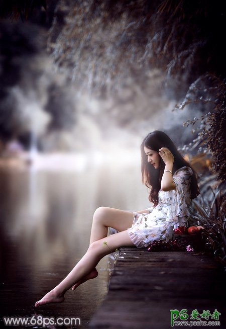 PS美女图片调色教程:给湖边自拍的玉腿美足清纯少女写真照调出梦幻的暗褐色效果,素材图是以绿色调为主的,我们设计师通过后期调色美化,增加一些烟雾效果,增加唯美度让美女图变得更加漂亮,喜欢的朋友们好好学习一下吧!原图