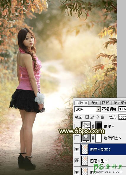 17、按Ctrl + J 把当前图层复制一层,混合模式改为“滤色”,不透明度改为:30%,效果如下图。这几步给图片中间位置增加高光。