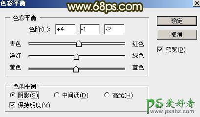 8、创建色彩平衡调整图层,对阴影进行调整,参数及效果如下图。这一步给图片暗部增加暖色。