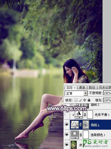 2、按Ctrl + Alt + 2 调出高光选区,按Ctrl + Shift + I 反选得到暗部选区,然后创建曲线调整图层,对RGB、红、绿、蓝通道进行调整,参数及效果如下图。这一步把图片暗部颜色加深,并增加蓝紫色。