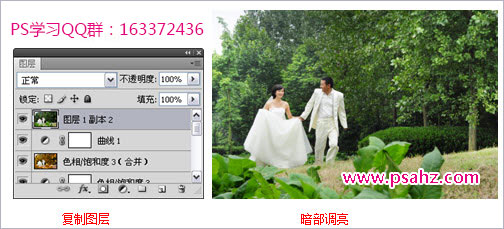 1)单击“背景”图层,使其成为当前图层,按下快捷键Ctrl+J,将背景图层复制到新图层中,生成“图层1 副本2”,按下快捷键Ctrl+Shift+],将该图层放置到最上层位置。单击套索工具,在图像上拖曳,将暗部区域创建为选区,并通过调整曲线,将图像暗部调亮。