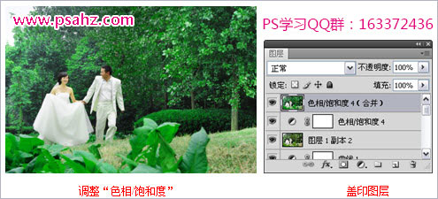 2)按照同上面步骤相似的方法,调整图像的“色相/饱和度”,使图像中的绿色部分更加明显,使绿色更纯粹。将“图层1副本2”和“色相/饱和度4”同时选中,按下快捷键Ctrl+Alt+E,将当前图层盖印到新图层中,生成“色相/饱和度4(合并)”。