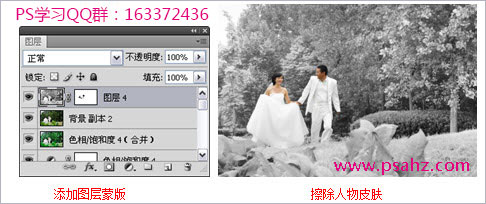 4)在“图层”面板中单击“添加图层蒙版”按钮。单击画笔工具,在图层蒙版中涂抹,将人物皮肤显现出来。