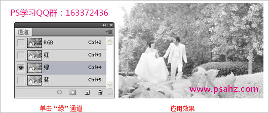 3)在“通道”面板中,单击选中“绿”通道,使其他通道颜色不可见。按下快捷键Ctrl+A,将该通道图像全选,然后按下快捷键Ctrl+C,复制选区中图像,单击RGB通道,按下快捷键Ctrl+V,将复制的图像复制到当前图层对象中。
