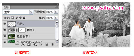 5)新建“图层5”。设置前景色为“白色”,使用画笔或者使用其余方法在图像中添加雪花效果。