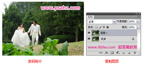 1)打开Photoshop,按下快捷键Ctrl+O,打开素材文件。按下快捷键Ctrl+J,复制背景图层到新图层中,生成“图层1”。