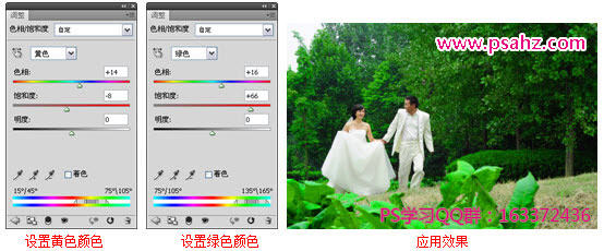 2)在“图层”面板中,单击“图层”面板下方的“创建新的填充或调整图层”按钮,弹出菜单后选择“色相/饱和度”选项,在“调整”面板中切换到“色相/饱和度”调整面板中,设置黄色的色相为+14,饱和度为-8。然后设置绿色的色相为+16,饱和度为+66。完成设置后,即可将设置的参数应用到当前图像中。
