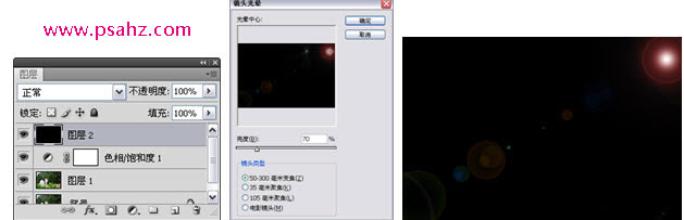 3)按下快捷键Shift+Ctrl+Alt+N,新建“图层2”,将该图层填充为“黑色”。执行“滤镜>渲染>镜头光晕”命令,打开“镜头光晕”对话框,设置亮度70%,单击“50-300毫米变焦”选项。完成设置后,单击确定按钮,将设置的效果应用到当前图层对象中。