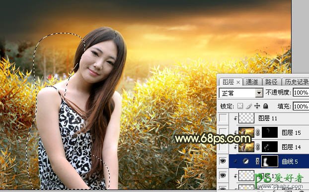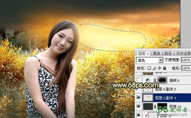 20、新建一个图层,用套索工具勾出下图所示的选区,羽化50个像素后填充橙黄色:#FDAD5C,取消选区后把混合模式改为“滤色”。