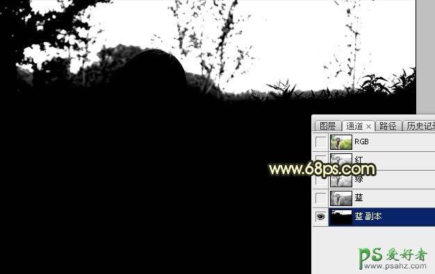 7、进入通道面板,把蓝色通道复制一份,得到蓝副本通道。然后按Ctrl + M 对蓝副本通道调整曲线,把暗部压暗,高光加亮,确定后再用黑色画笔把天空以外的部分涂黑,如下图。