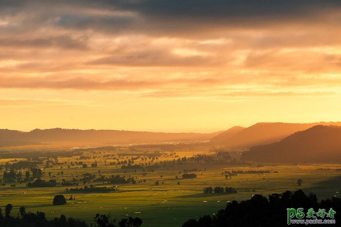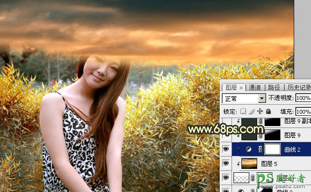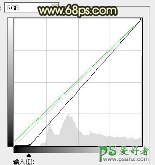 10、创建曲线调整图层,对RGB,绿通道进行调整,参数设置如图20,确定后创建剪切蒙版,效果如图21。这一步把天空稍微调暗一点。