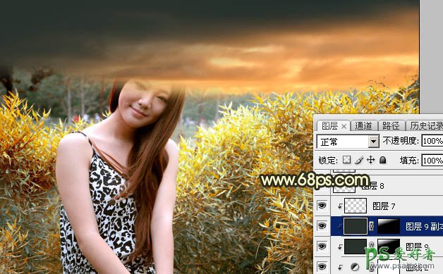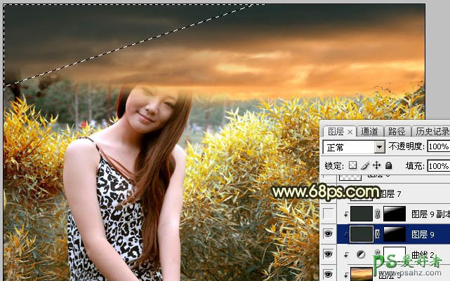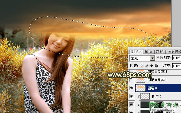 13、新建一个图层,用套索工具勾出下图所示的选区,羽化60个像素后填充橙黄色:#FDAD5C,取消选区后把混合模式改为“柔光”。
