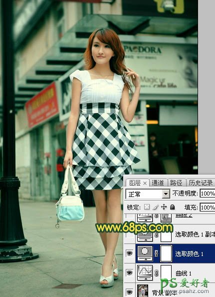 Photoshop给街景上自拍的可爱女孩儿生活照调出温暖的阳光青色调