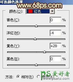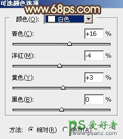 17、创建可选颜色调整图层,对红、黄、白进行调整,参数设置如图33 - 35,确定后创建剪切蒙版,效果如图36。这一步给肤色增加橙黄色。