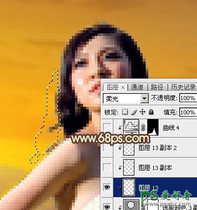 19、新建一个图层,混合模式改为“柔光”,然后创建剪切蒙版,用吸管工具吸取头发附近的暖色,然后用透明度较低柔边画笔把头发受光边缘涂上前景色。