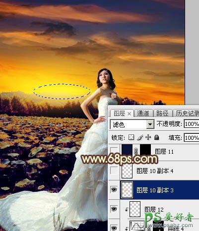 22、新建一个图层,用椭圆选框工具拉出下图所示的选区,羽化25个像素后填充橙黄色:#F9A51A,取消选区后把混合模式改为“滤色”,效果如下图。