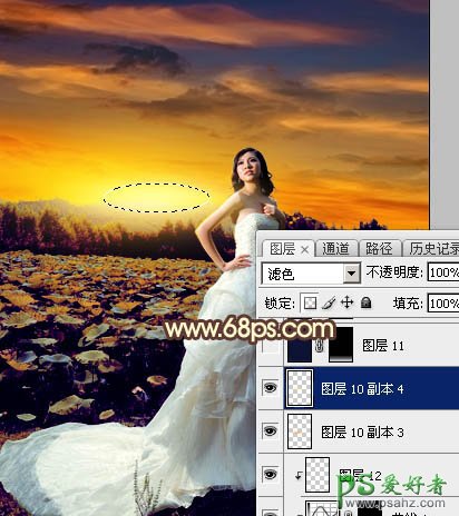 23、新建一个图层,用椭圆选框工具拉出下图所示的选区,羽化25个像素后填充淡黄色:#FBE694,取消选区后把混合模式改为“滤色”,效果如下图。这两步增加高光亮度。