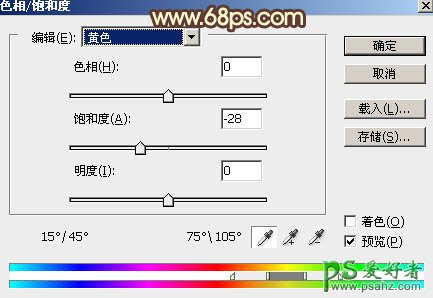 5、创建色相/饱和度调整图层,对黄色进行调整,参数及效果如下图。这一步适当降低暖色饱和度。
