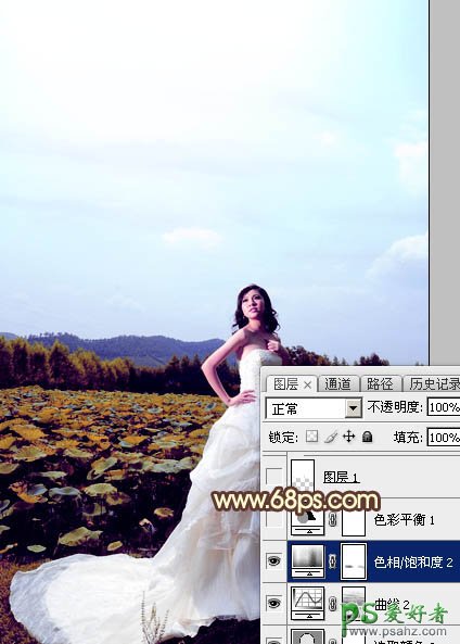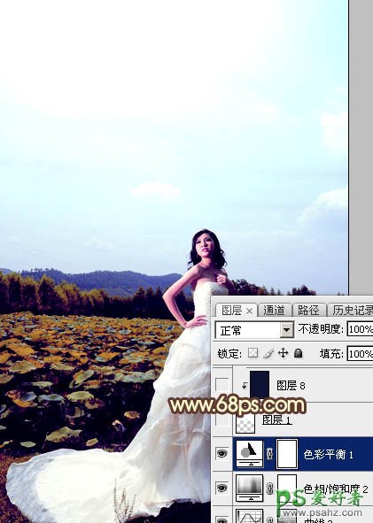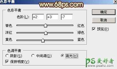6、创建色彩平衡调整图层,对阴影,高光进行调整,参数及效果如下图。这一步给图片暗部增加蓝色,高光区域增加淡黄色。