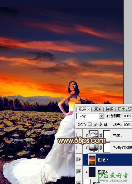 PS婚纱照调色教程:给荷塘边外拍的美女大气婚纱照调出温暖的晨曦