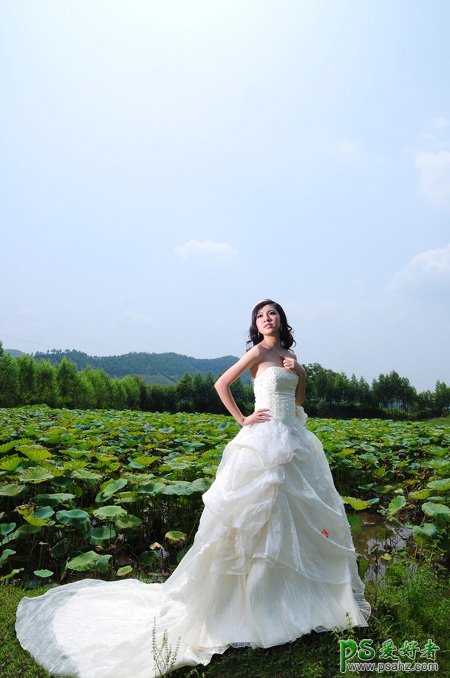 PS婚纱照调色教程:给荷塘边外拍的美女大气婚纱照调出温暖的晨曦