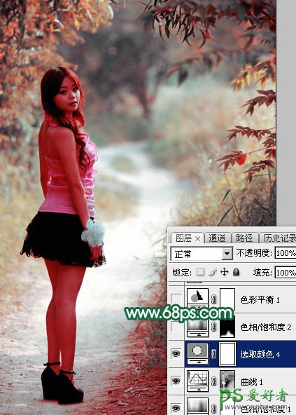 Photoshop给树林中自拍的美腿女孩生活照调出暗调秋季青红色
