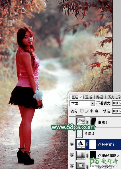 Photoshop给树林中自拍的美腿女孩生活照调出暗调秋季青红色