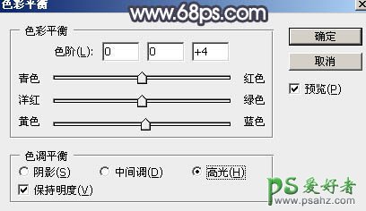 8、创建色彩平衡调整图层,对阴影,高光进行调整,参数设置如图18,19,确定后按Ctrl + Alt + G 创建剪切蒙版,效果如图20。这一步微调中间区域高光及暗部颜色。