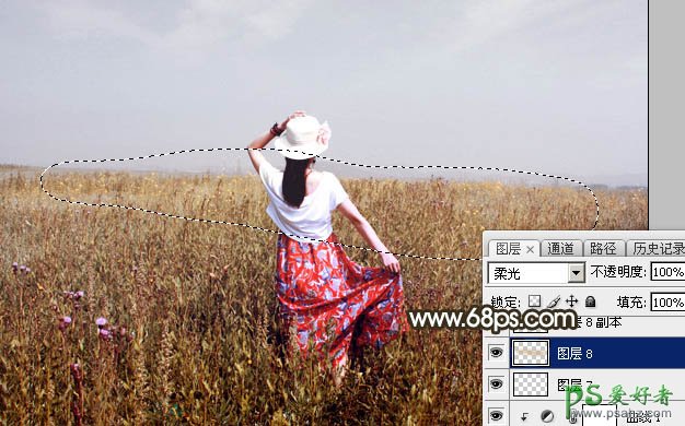 16、新建一个图层,用套索工具勾出下图所示的选区,羽化60个像素后填充黄褐色:#C9B18D,取消选区后把混合模式改为“柔光”,效果如下图。