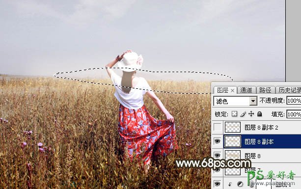 17、新建一个图层,用套索工具勾出下图所示的选区,羽化35个像素后填充同上的黄褐色,取消选区后把混合模式改为“滤色”,效果如下图。