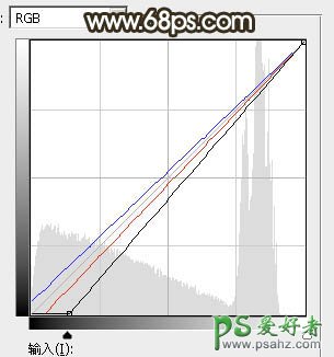 20、创建曲线调整图层,对RGB、红、蓝通道进行调整,参数设置如图40,确定后把蒙版填充黑色,然后用白色画笔把边角区域擦出来,效果如图41。这一步给图片增加暗角。
