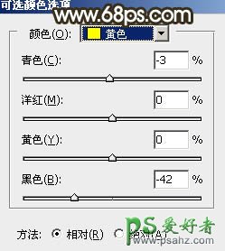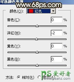 3、创建可选颜色调整图层,对红色,黄色进行调整,参数设置如图6,7,确定后用透明度较低柔边黑色画笔把底部区域擦出来,效果如图8。这一步把草地颜色调淡一点。