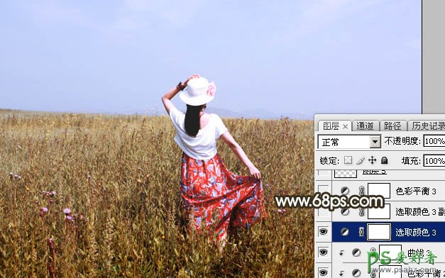 Photoshop给荒野中自拍的唯美意境女生写真图片调出冷调秋景色,素材图片为夏季图片,转秋季色的时候把草地部分的颜色转为较暗的中性黄褐色;最后我们再给天空部分加一点淡蓝色,让整体效果变得更加梦幻,喜欢的朋友们好好学习一下吧! 原图 最终效