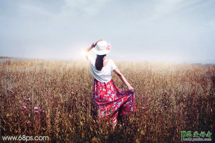 Photoshop给荒野中自拍的唯美意境女生写真图片调出冷调秋景色,素材图片为夏季图片,转秋季色的时候把草地部分的颜色转为较暗的中性黄褐色;最后我们再给天空部分加一点淡蓝色,让整体效果变得更加梦幻,喜欢的朋友们好好学习一下吧!