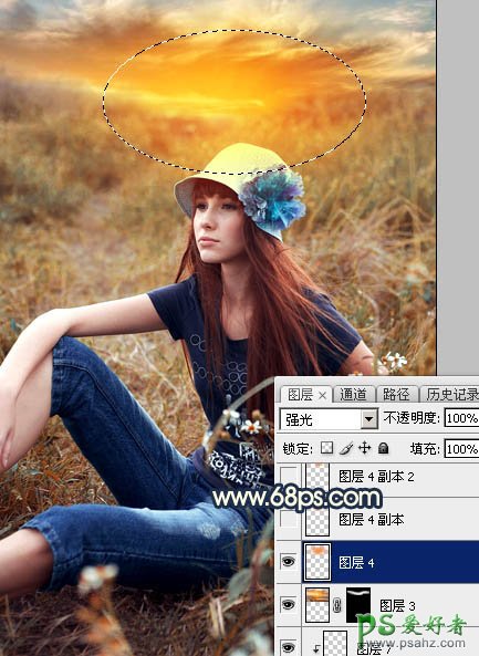 15、新建一个图层,现在来渲染一些高光。用椭圆选框工具拉出下图所示的椭圆选区,羽化60个像素后填充橙红色:#F0923B,取消选区后把混合模式改为“强光”,效果如下图。