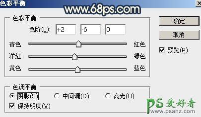 8、创建色彩平衡调整图层,对阴影进行调整,参数及效果如下图。这一步微调暗部颜色。