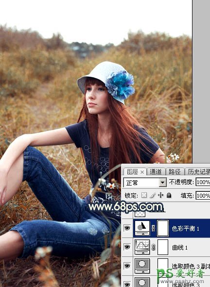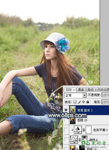 PS美女图片调色:给草丛中自拍的欧美女生照片调出柔和的晨曦霞光